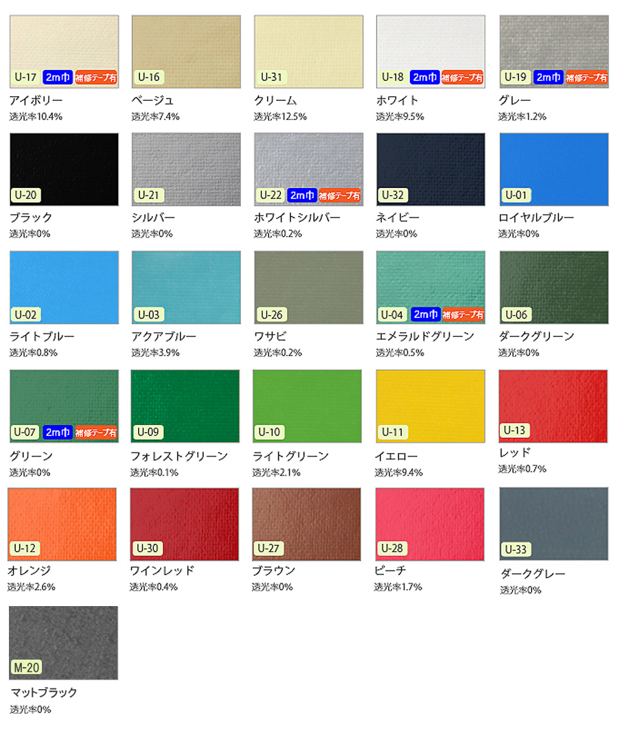 ※基本的には濃い色ほど遮光性が上がりますので、光を通す生地をご希望の場合は薄い色をお選びください。透光率の数値が高いほど日差しなどの光を通す目安となります。